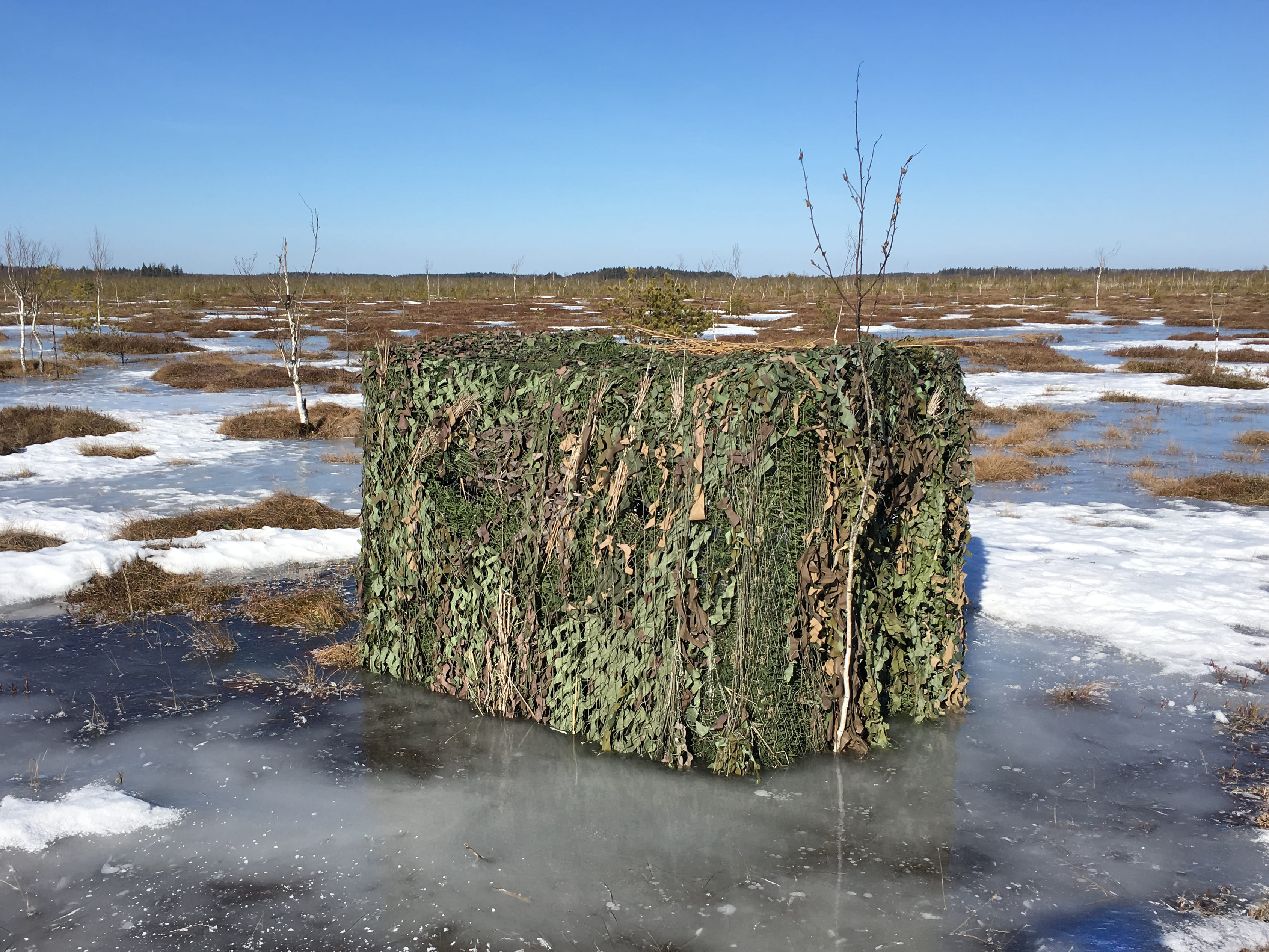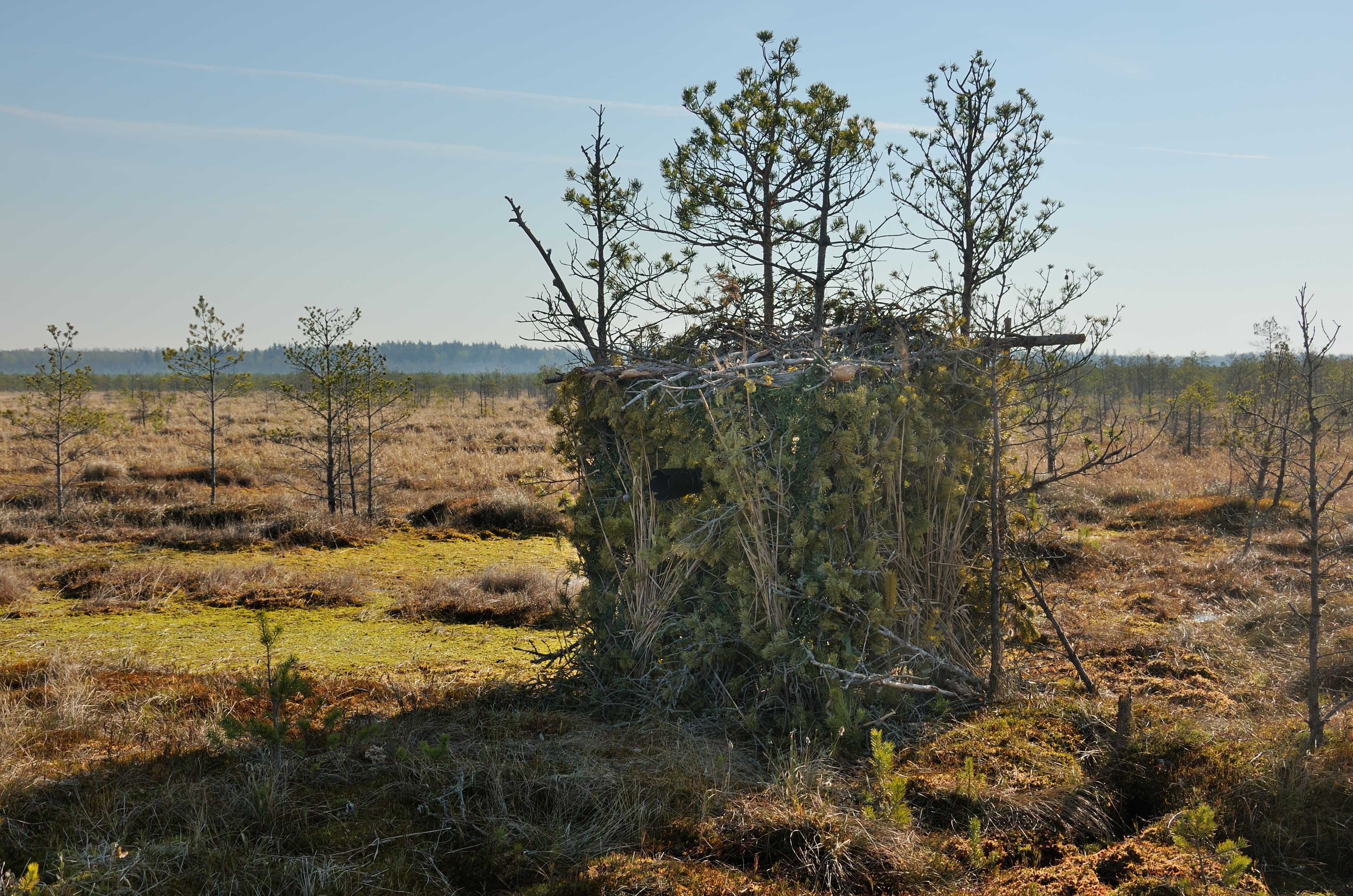 Болото засасывало сапоги, иногда на пути попадались глубокие ямки, где воды было намного выше колена. Ко всему этому добавлялся вес рюкзака, одним словом - настоящий экстрим! А вокруг тишина, лишь шум болотной пучины, реагирующий на каждый наш шаг, содрогал ее. В течение сорока минут мы добрались до места токования. Было заметно, как постепенно меняется ландшафт, исчезают невысокие сосенки, типичные для верхового болота, уровень воды повышается, появляются большие кочки, укрытые ковром изо мха. Через несколько десятков метров появился шалаш, стрелки часов показывали без четверти четыре. Мы быстро забрались в укрытие, подготовили все необходимое, выключили фонарики и стали ждать. Сквозь маскировочную сетку в лунном свете хорошо просматривалась местность, узкая полоска неба на востоке становилась все светлее – приближался рассвет. Недалеко слышались голоса бекасов, а на северном и южном краях болота изредка кричали журавли. Самое время согреться кружечкой горячего чая, что придавало ситуации еще больше романтики.