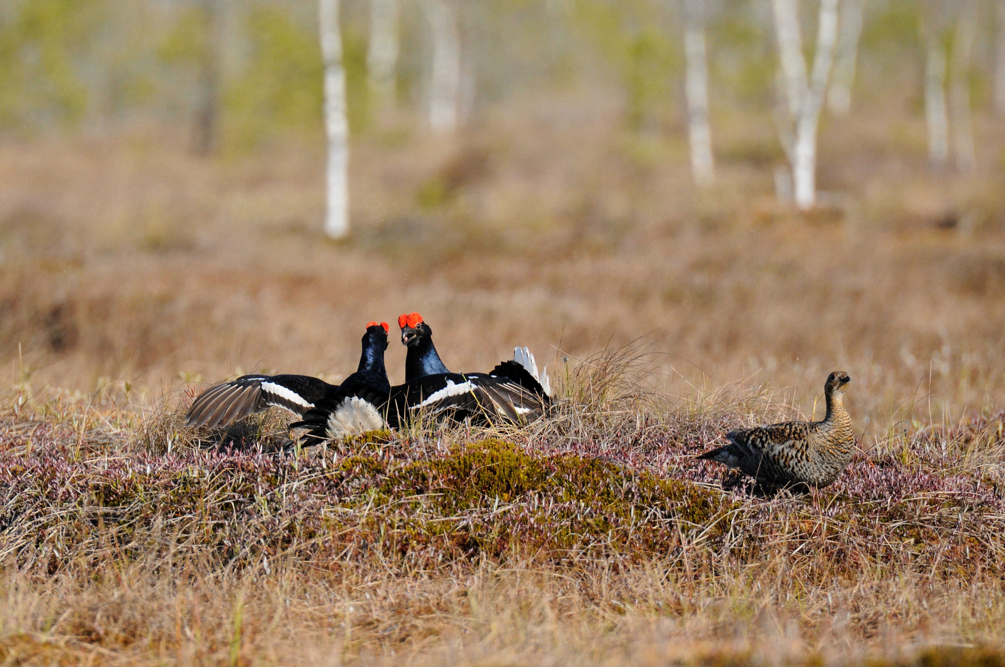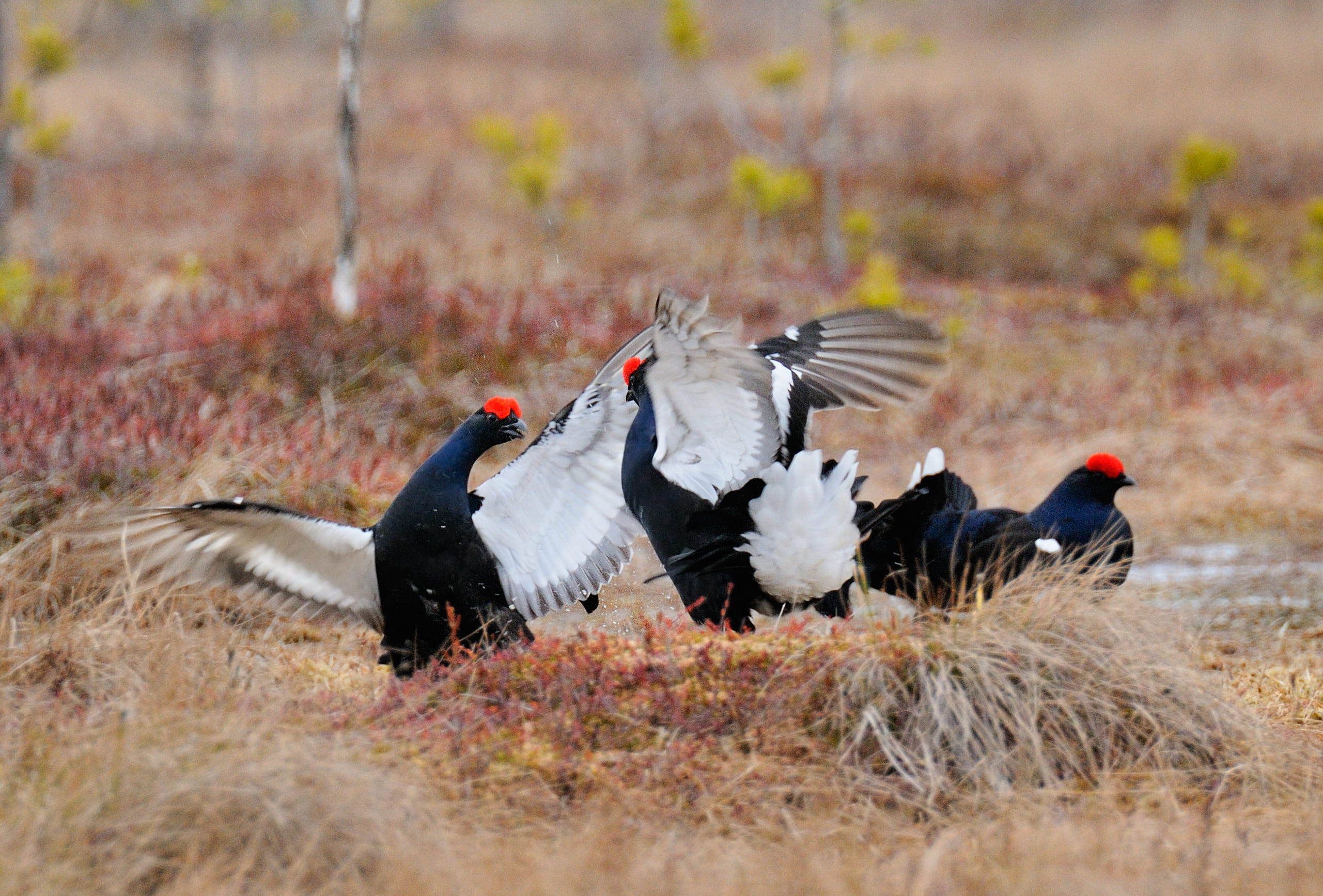 Активность птиц продолжала увеличиваться: они бегали по кочкам, кружились, подпрыгивали, делая «свечи», перелетали с места на место. Все эти нехитрые манипуляции неизбежно привлекали самочек, которые прилетев, рассаживались на редких сосенках и наблюдали за всем происходящим. Самцы начинали бои.